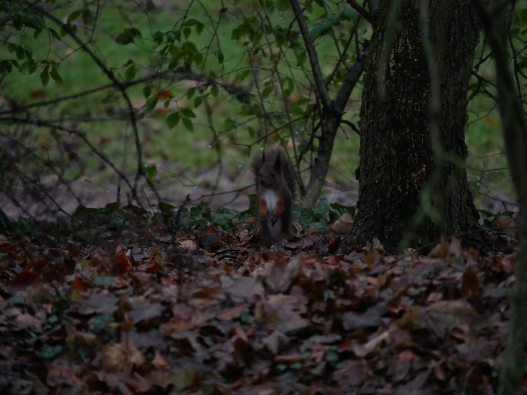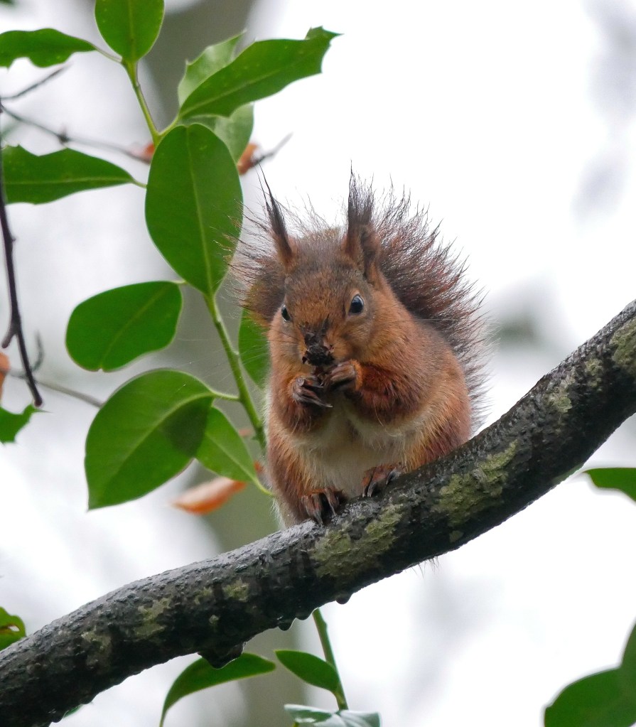 Allt är grått och vinden piskar runt regnet brutalt. Inget väder som tillför behag och välbefinnande. Jag själv blir oroligt när allt runtomkring är ett blött och vindigt inferno. Ekorren däremot finner lugnet denna dag. Yvig och genomblöt lunkade han fram och tillbaka för att leta mat.